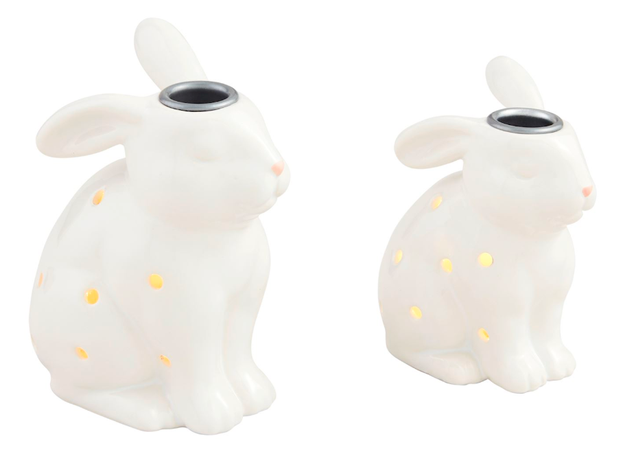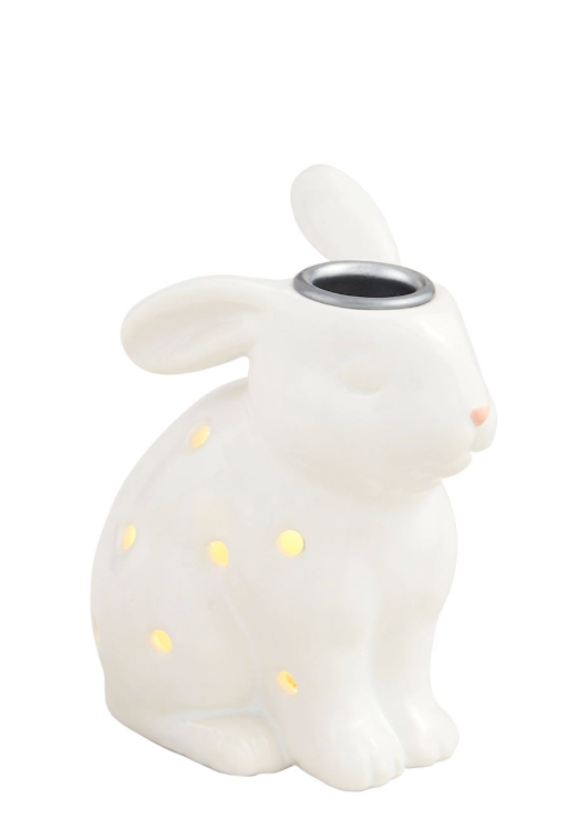 Light-up LED ceramic bunny taper holder features pierced holes to allow light passage. Battery included.