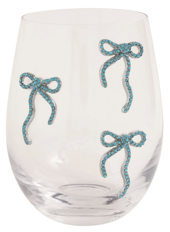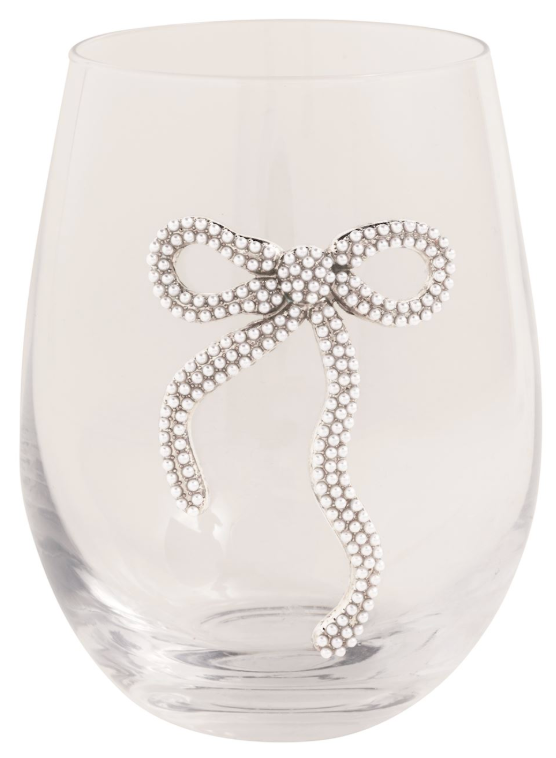 Stemless wine glass with beaded bow exterior.