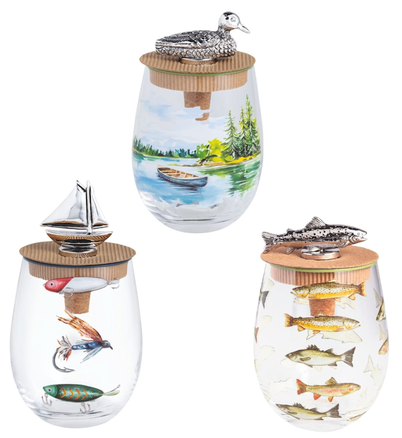 2-piece set. Stemless wine glass with hand-painted rim. Comes with cork bottle stopper with metal figural topper.