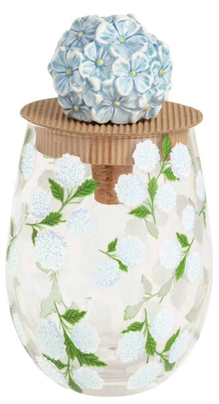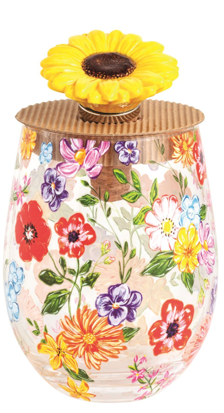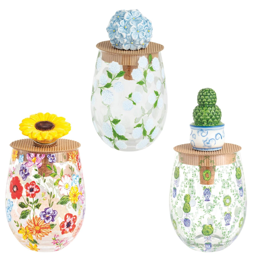 2-piece set. Stemless wine glass comes with ceramic flower topped cork bottle stopper.