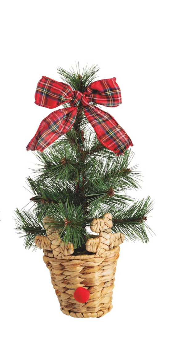 Faux mini fraser fir tree with tartan bow topper rests in reindeer water hyacinth basket.