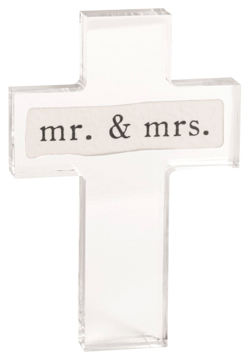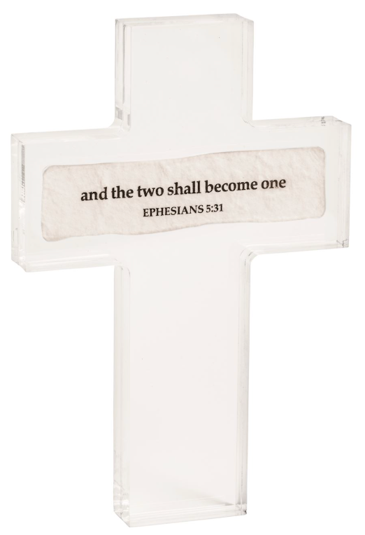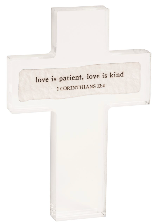 Pressed acrylic cross features sentiment pulp paper detail.
