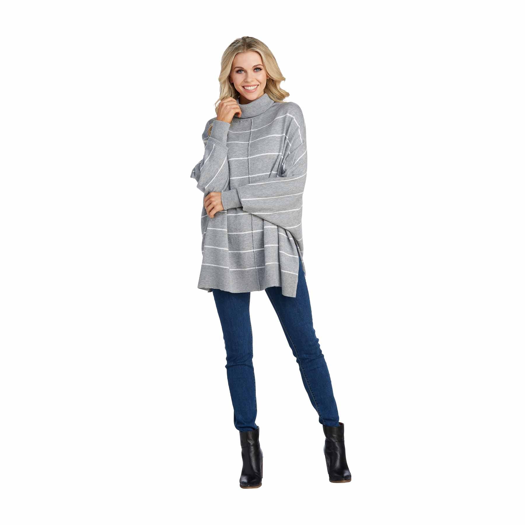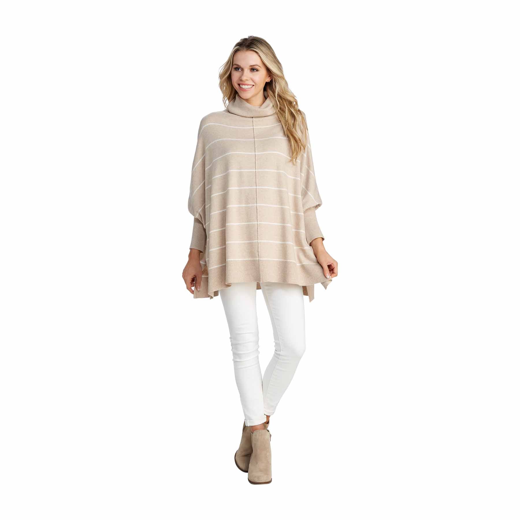 Poly knit blend poncho features center accent seam and ribbed turtleneck, sleeve openings and hem with side slit detail. One size fits most. Measures approximately 28 ¾" from shoulder to hem.