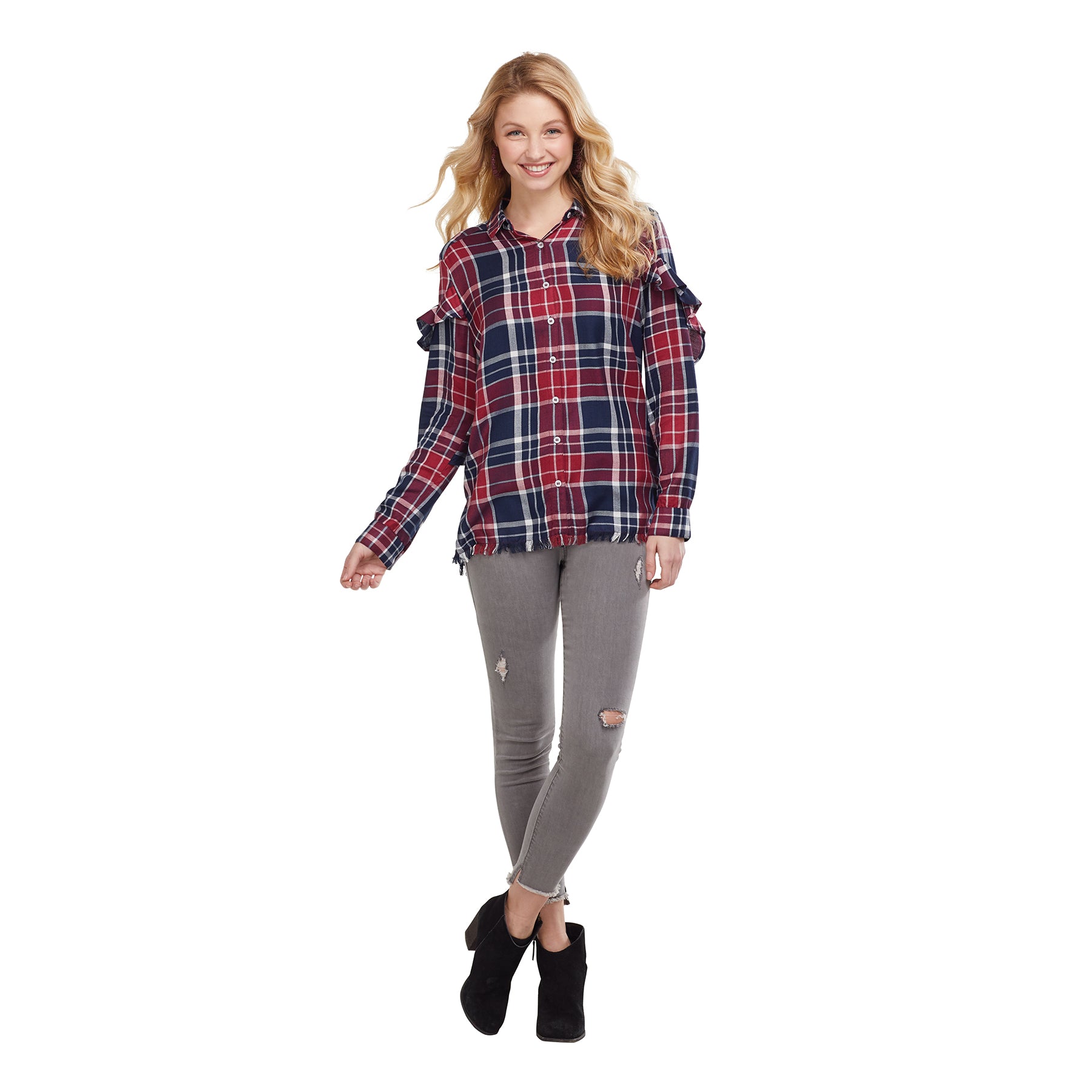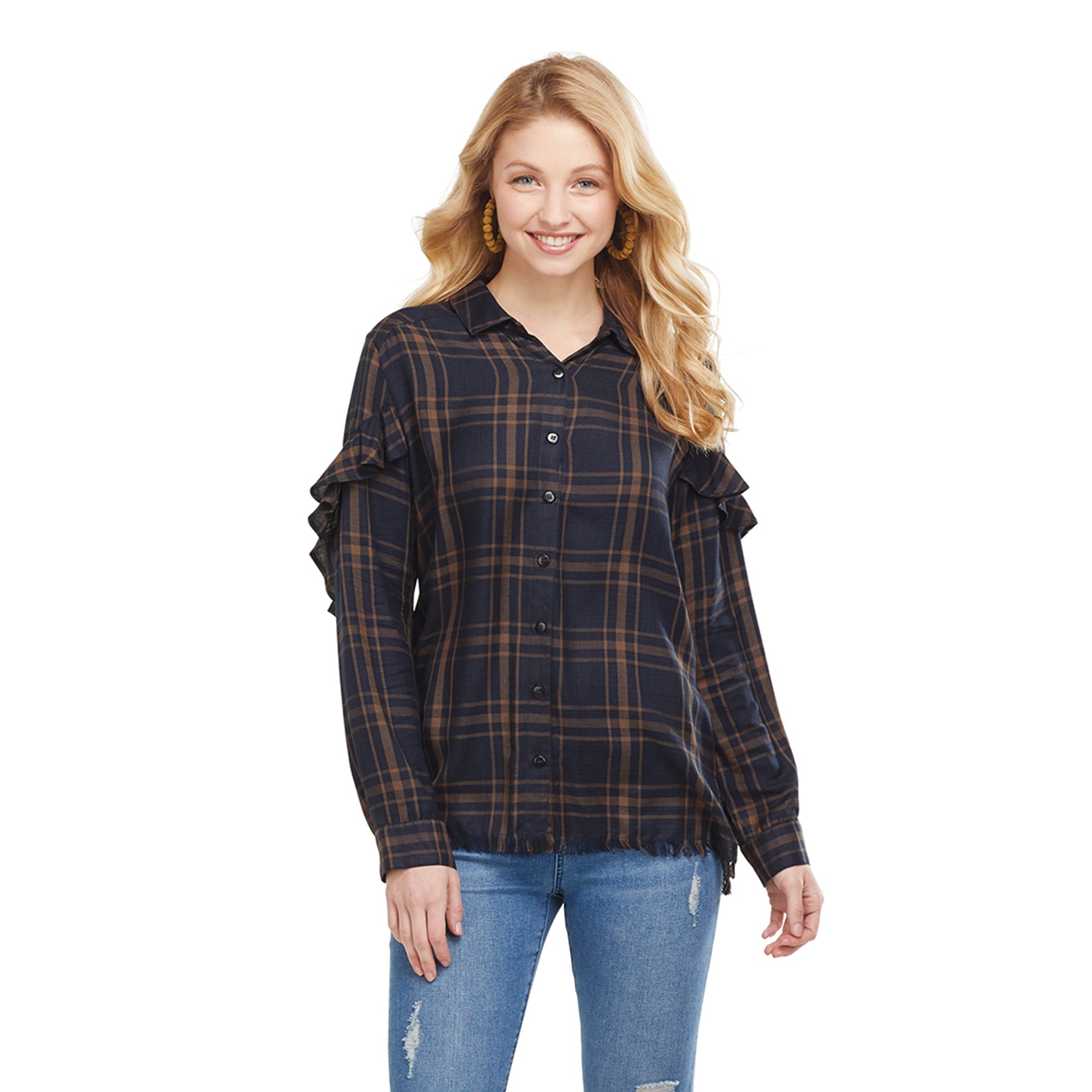 Woven viscose twill button-down features ruffles at sleeves, raw edge hem and pearlized button placket.