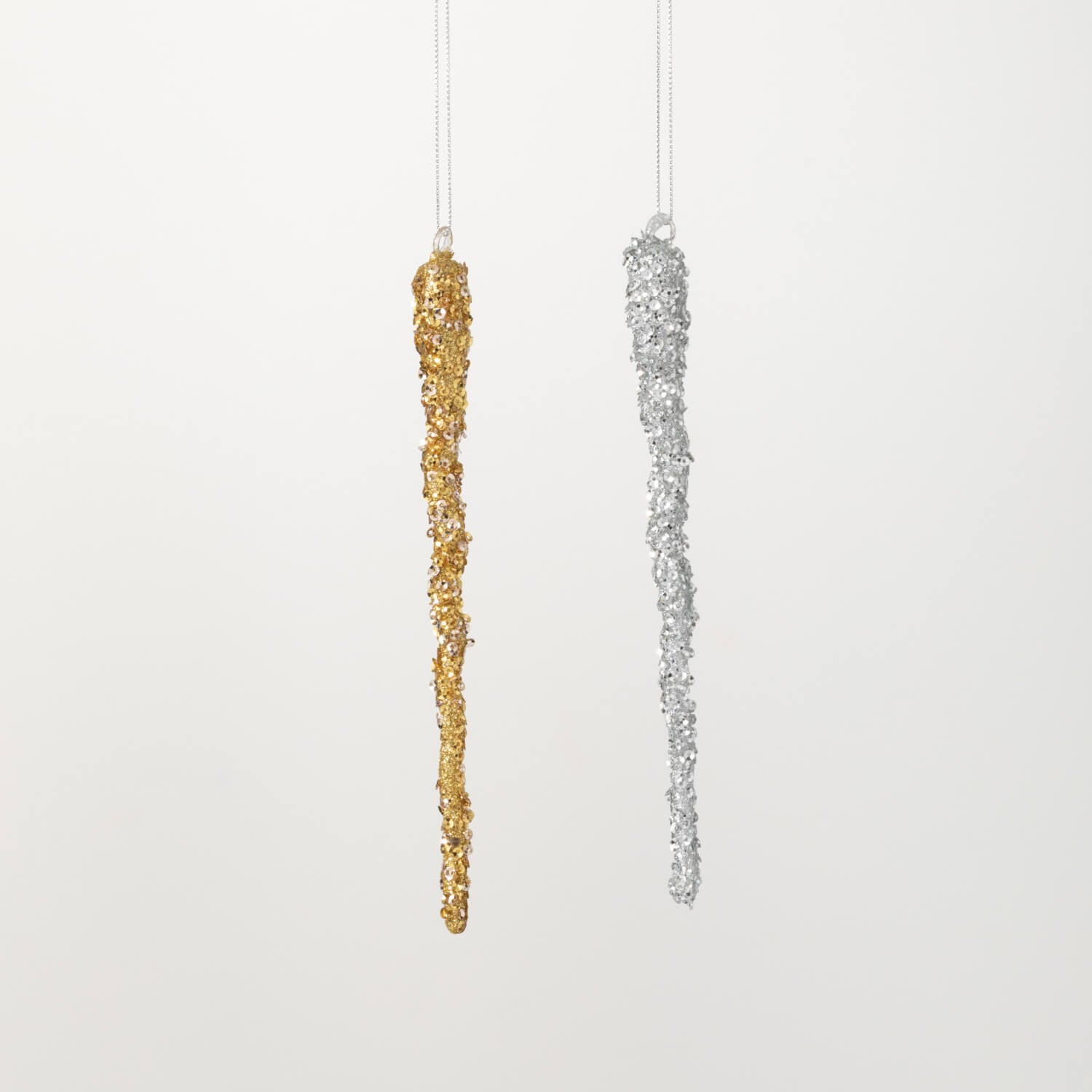 Glittery and gleaming for attention, these sparkly glass icicles will make for a stunning accent on any tree. Covered in metallic sequins, this gold and silver piece will take your breath away. Dimensions:.75"L x.75"W x7.5"