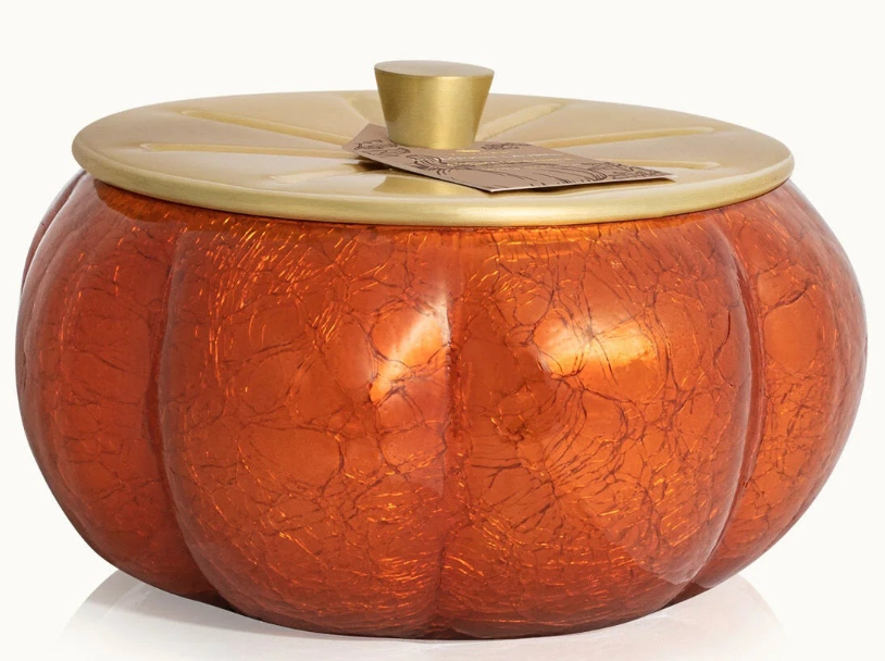 Embrace the autumn season and let moments of nostalgia fill your home with this statement candle. A nod to the season, this pumpkin-shaped candle creates a stunning home decor piece with its burnt orange, crackled finish, mercury gold accents, and complimentary gold lid. Enjoy the beautiful glow this candle creates and the classic mix of sweet and spice this fragrance evokes.