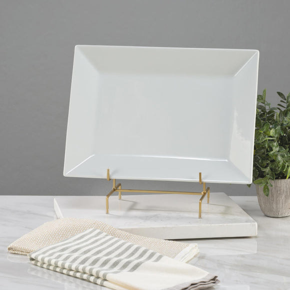 This stand is large and tall and is perfect for a displaying unique items. Its' extra wide base, tall back, deep brackets and square metal structure will hold the largest bowls, platters, books, artwork, cutting boards and more very securely. The elevated arms also accommodate deep curves that may sit below the arms but need elevation away from the table-top.