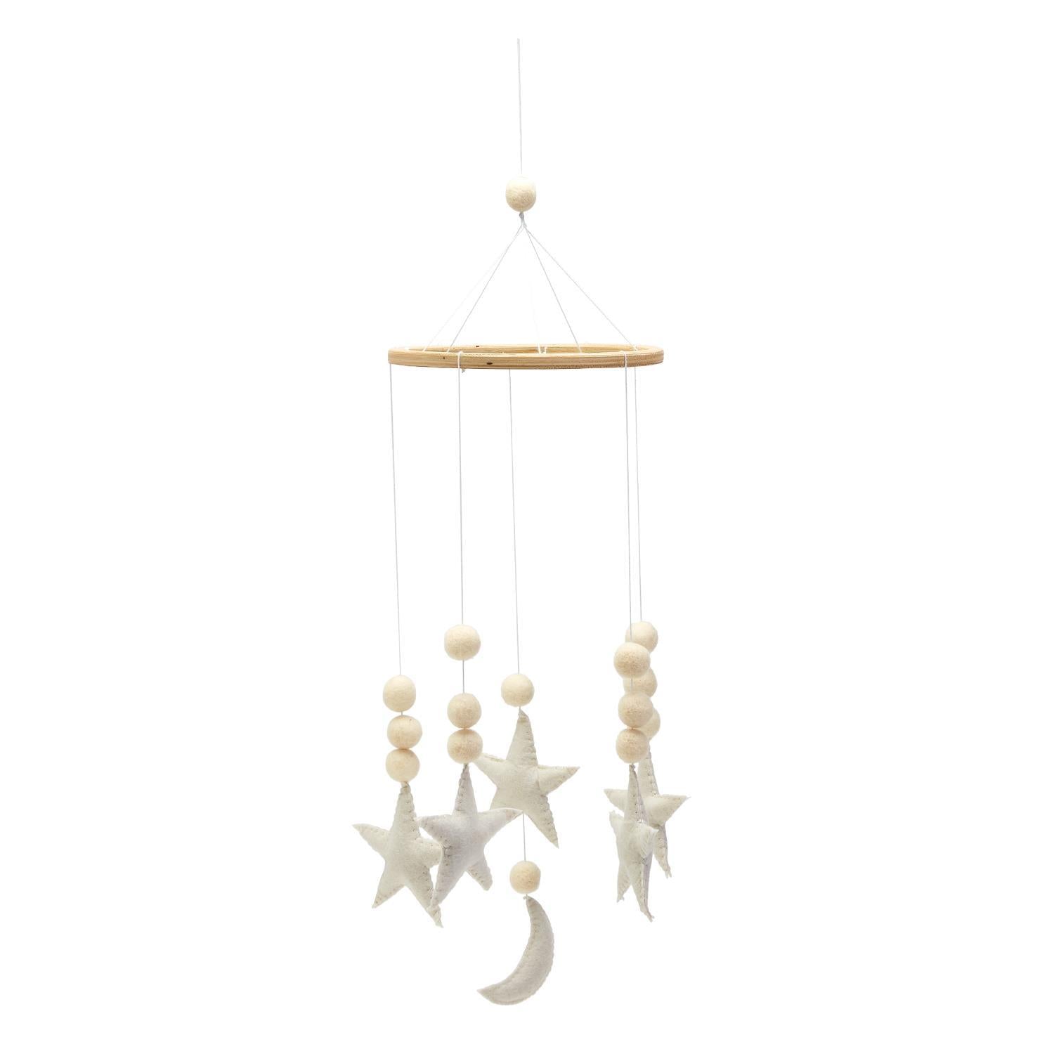A lovely soothing decorative piece to add into your new baby's nursery. The neutral colors are perfect for any baby boy or girl room. Featuring felt pompoms, stars and a moon giving off a peaceful ambiance.