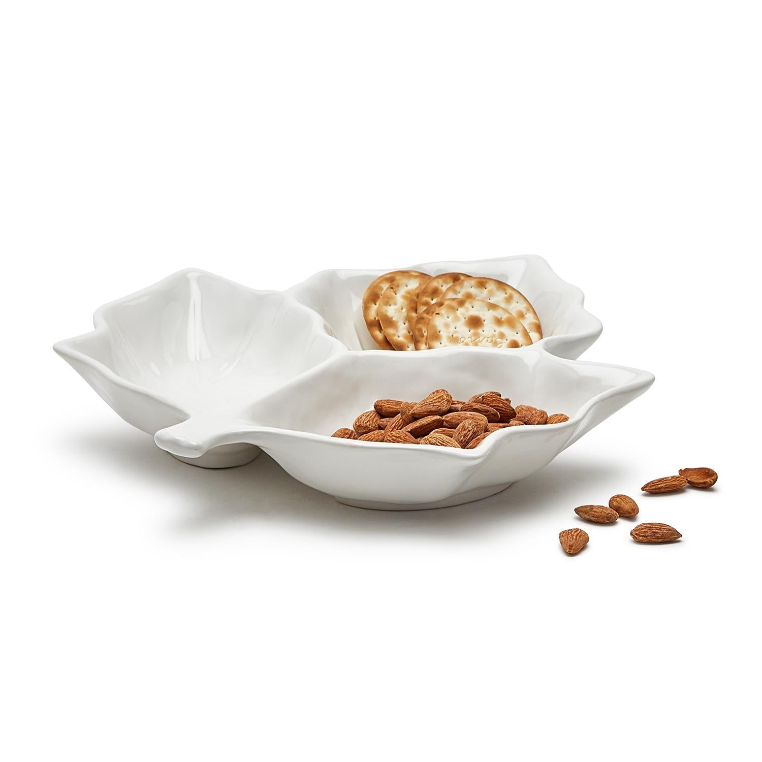 This leaf shaped serving dish comes in handy for small gatherings and big parties alike. With three sections, it can be used for appetizers, condiments, or nuts and candy. With an elegant leaf design, it's versatile enough for year-round use.