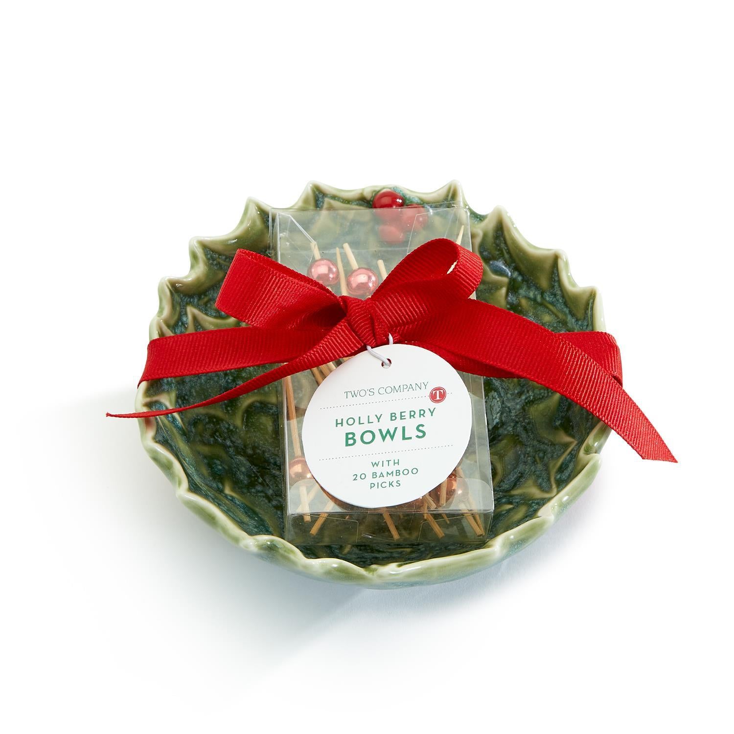 Two's Company TC 81676-20 Holly Leaves & Berries Tidbit Dish with Bamboo Sticks